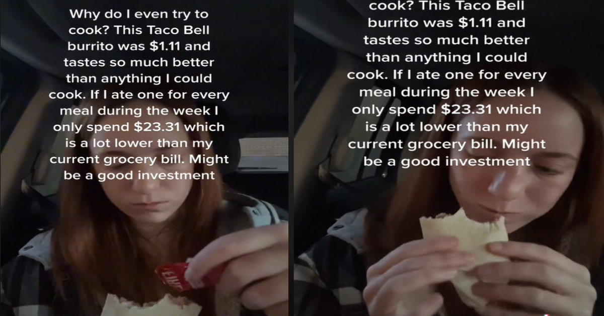 She says: “Why do I even try to cook? This Taco Bell burrito was $1.11 and tastes so much better than anything I could ever cook.”