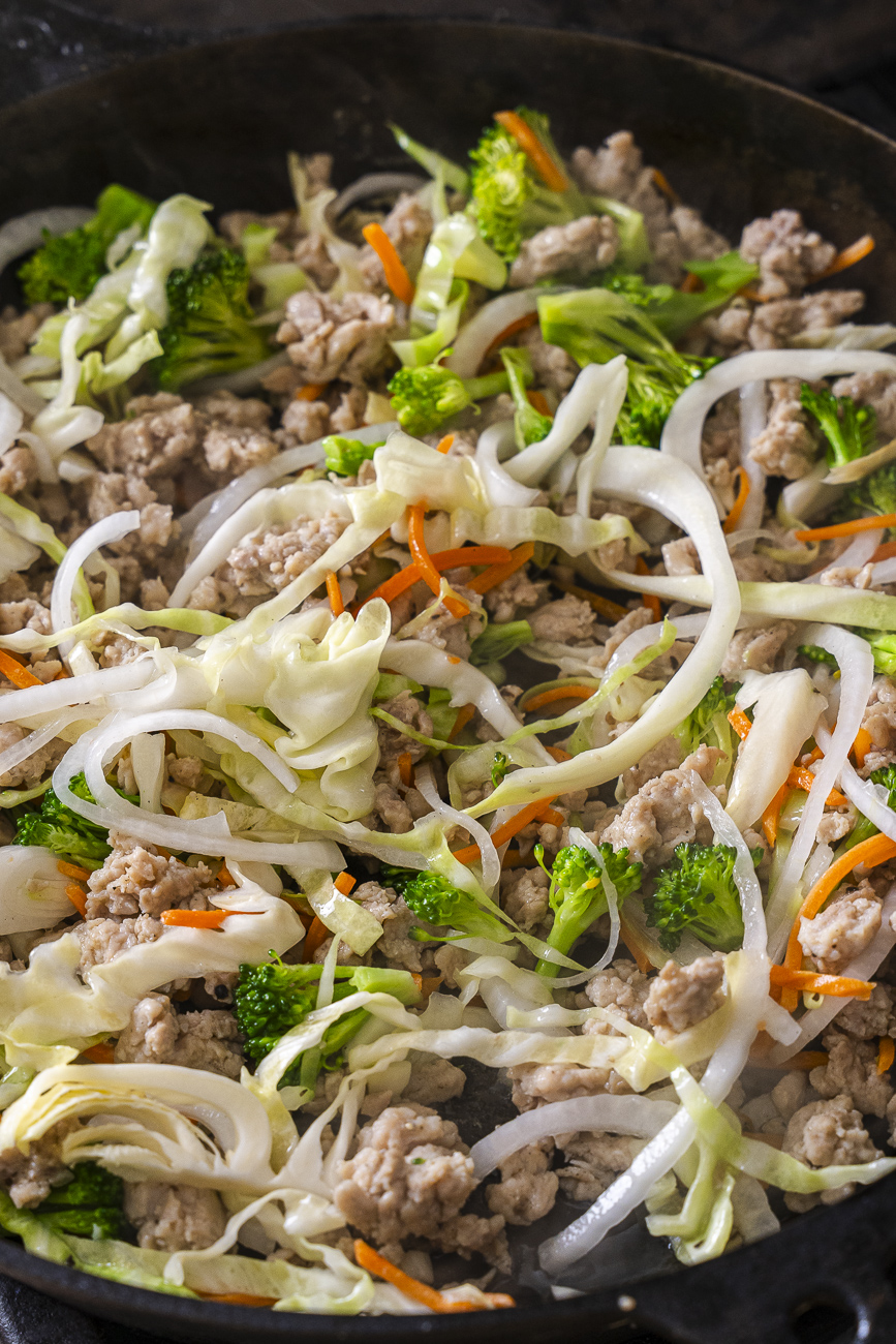 - Add garlic, onion, carrot, broccoli, and green cabbage and cook until vegetables have softened, 5-7 minutes.