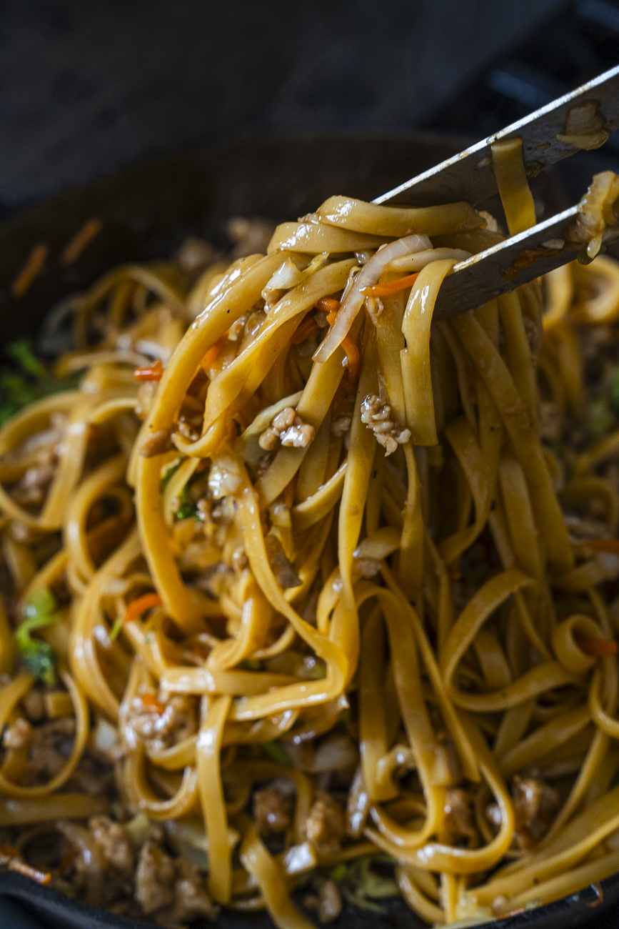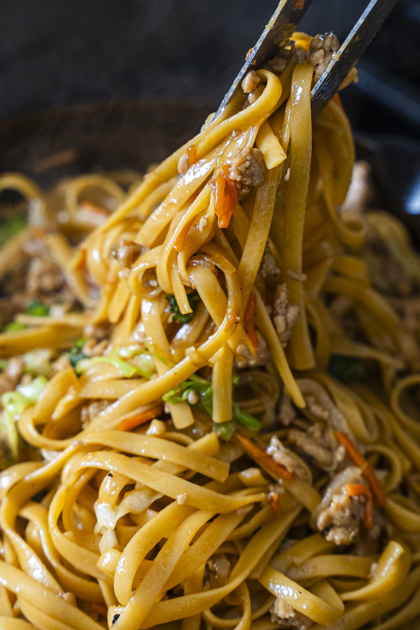 Once the chicken is browned, add in the garlic, onion, carrot, broccoli, and cabbage and cook until everything has softened and the kitchen smells incredible, which should just take about 5 minutes. Then add the drained noodles and pour the teriyaki sauce over everything, tossing to coat. Let it cook for just another minute or two until the sauce thickens up a bit and clings to every noodle.
