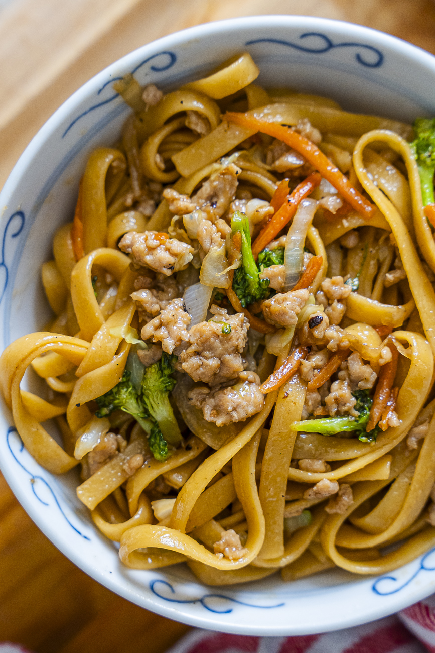 Start by boiling your noodles according to the package directions, then drain and set them aside. While the noodles cook, heat the oil in a large skillet or wok over medium-high heat and brown the ground chicken, breaking it apart as it cooks and seasoning it well with salt and pepper.