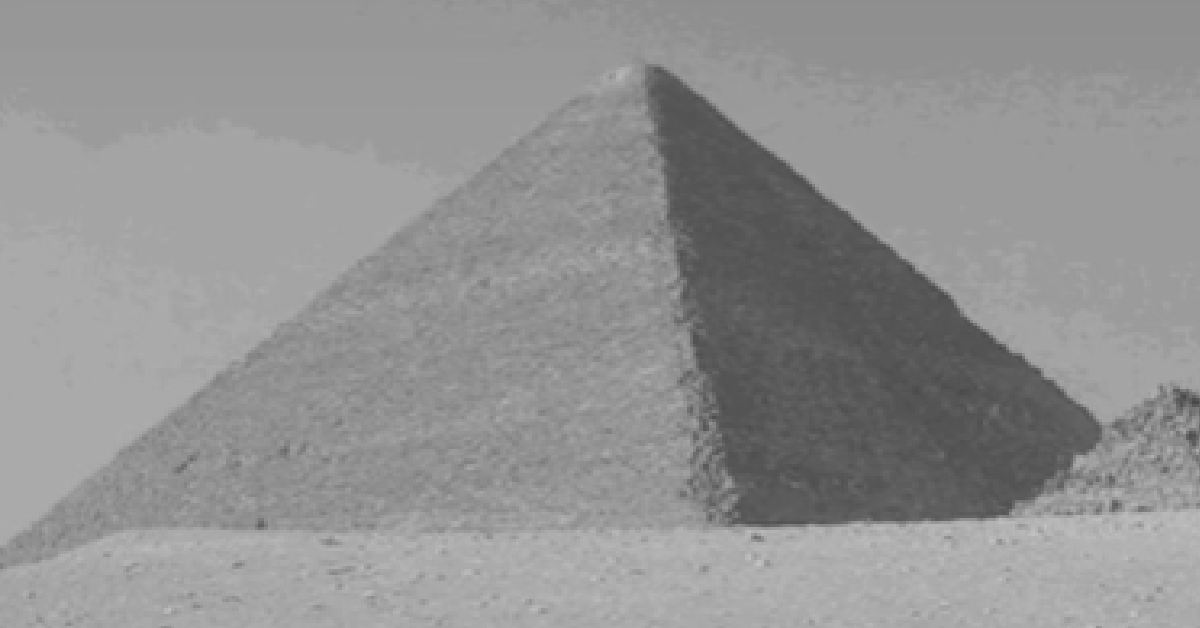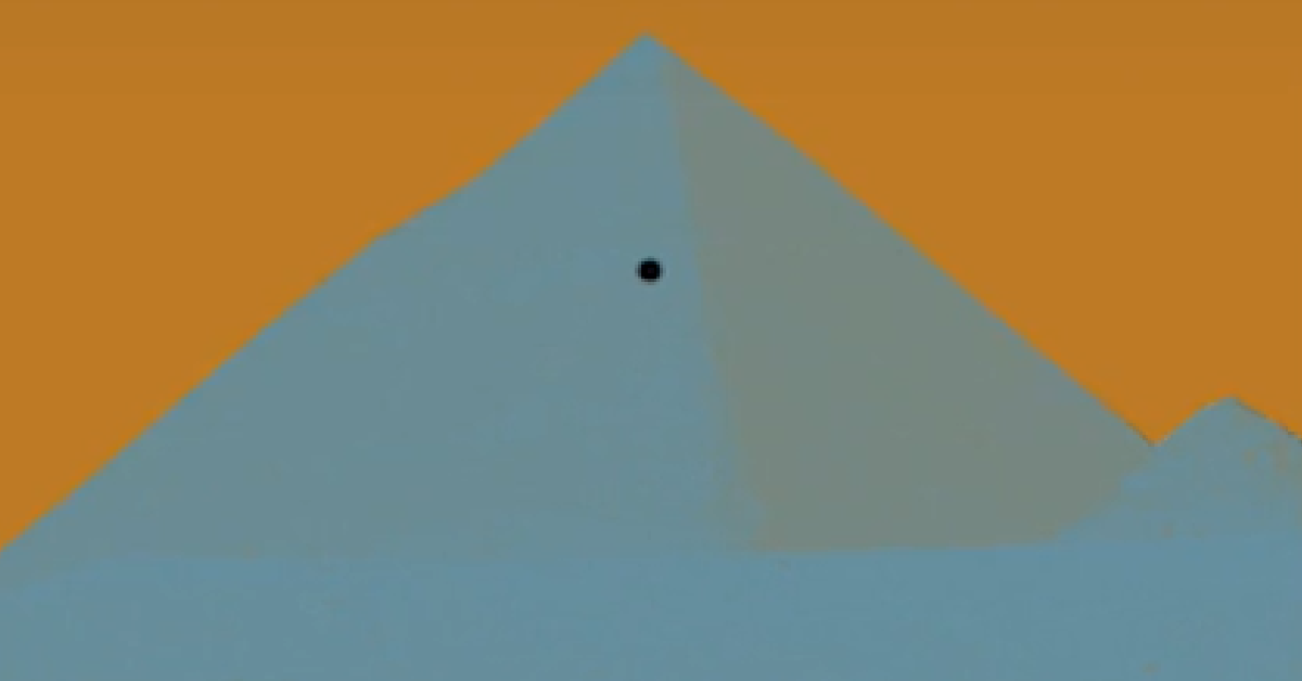 If you watch the video, you will see a pyramid that has a black dot located close to the apex. The structure seems to be shaded with a teal coloration and the sky behind it appears to be orange tinted.