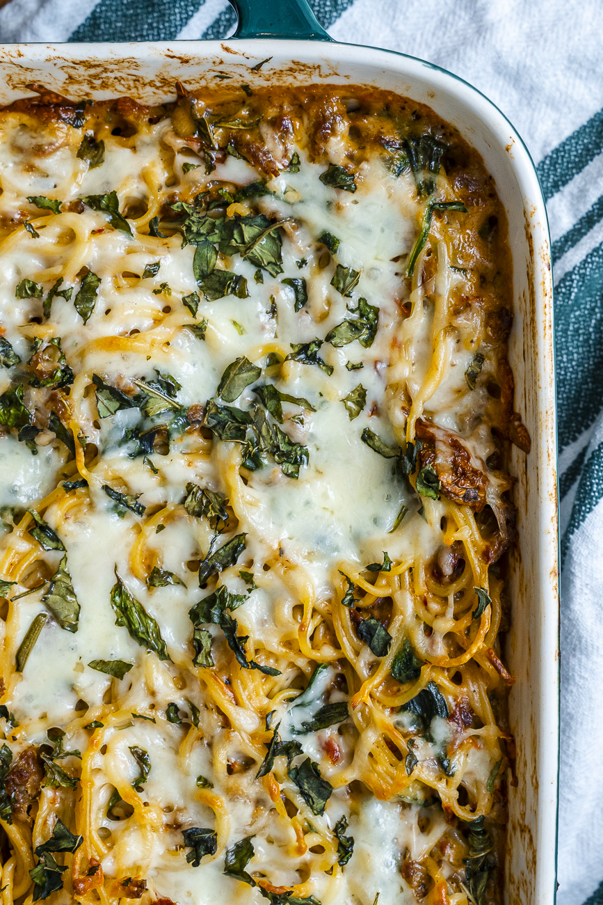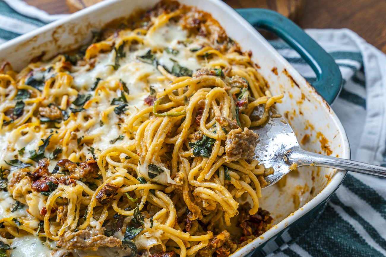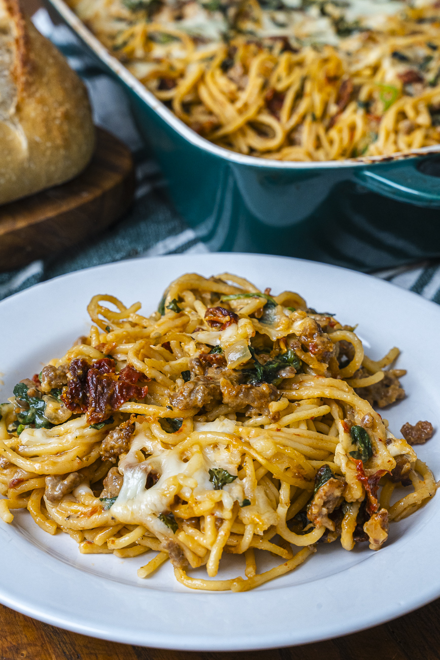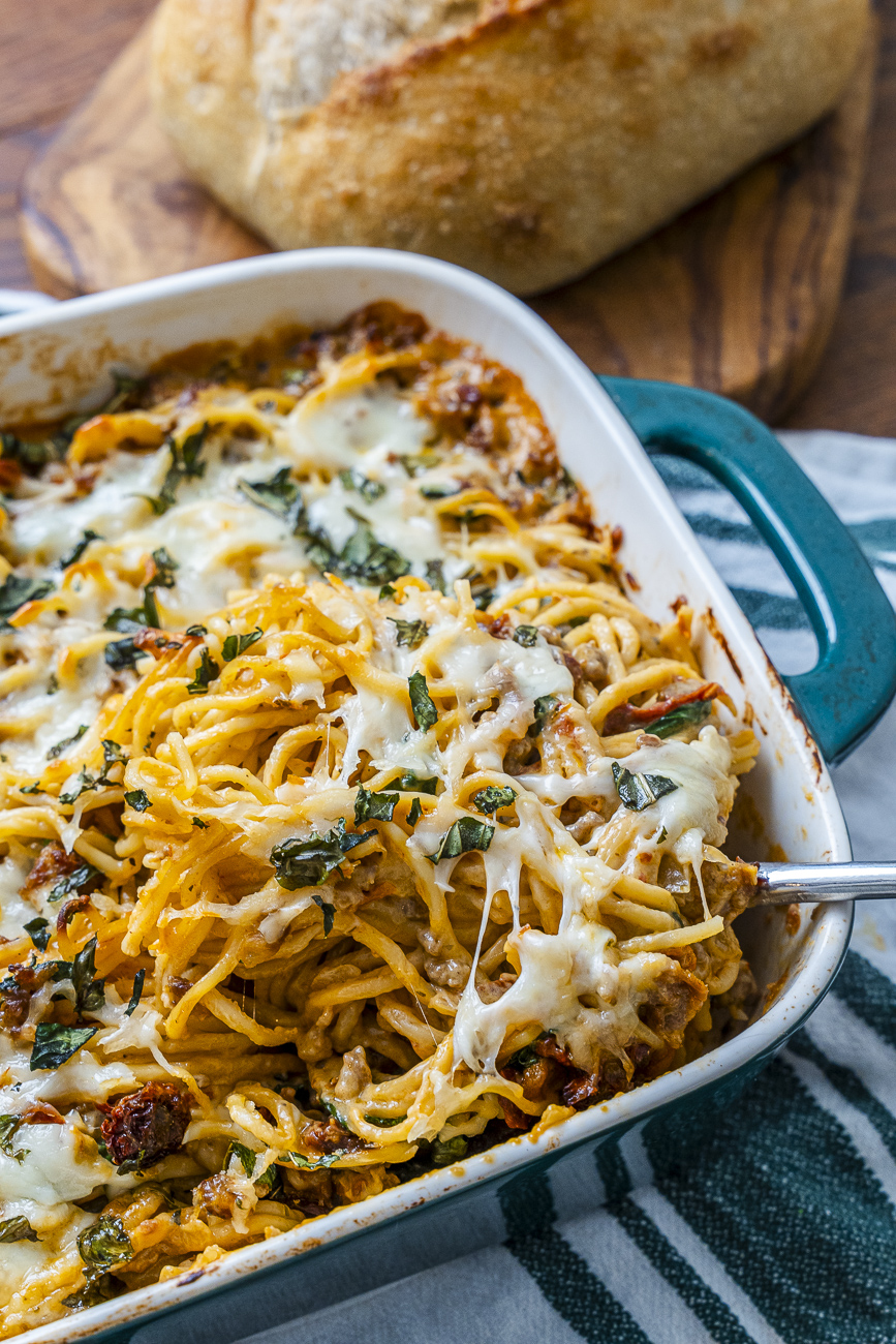 There are so many incredible baked pastas out there… I mean, it’s a classic comfort food for a reason! But this one is a little different than your usual red sauce and pasta bake. Loaded with creamy tuscan flavors, it comes together in just 10 minutes of prep, and it’s sure to have your whole table asking for seconds. (Which means it’s the perfect thing to bring into your regular dinner rotation.) This Tuscan Spaghetti Casserole is the kind of dish that feels special enough for company but easy enough for a weeknight. You know we love those!