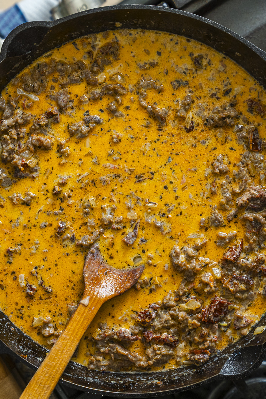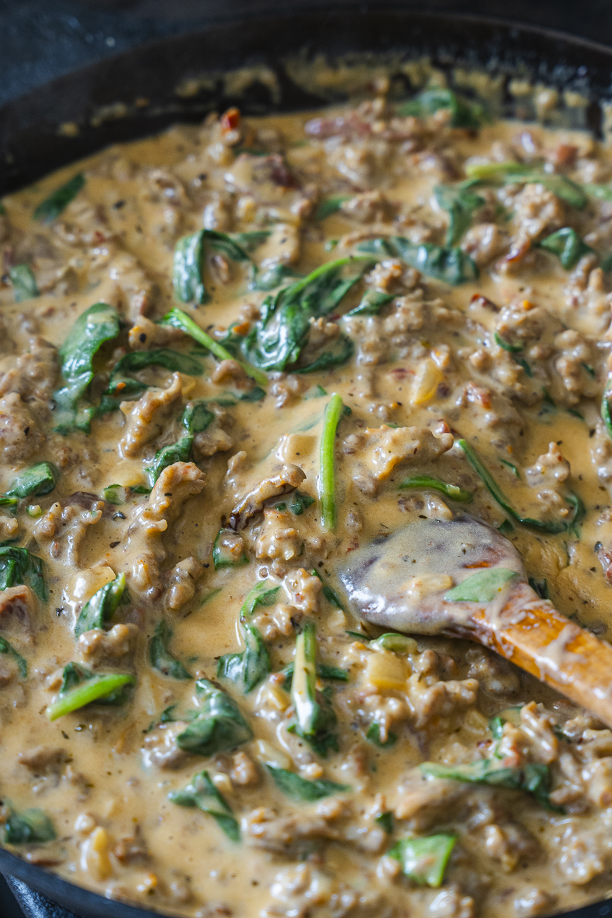 The flavors here are so delicious — tangy sun-dried tomatoes, earthy spinach, zesty sausage, all backed by a velvety creamy sauce. Yum!
