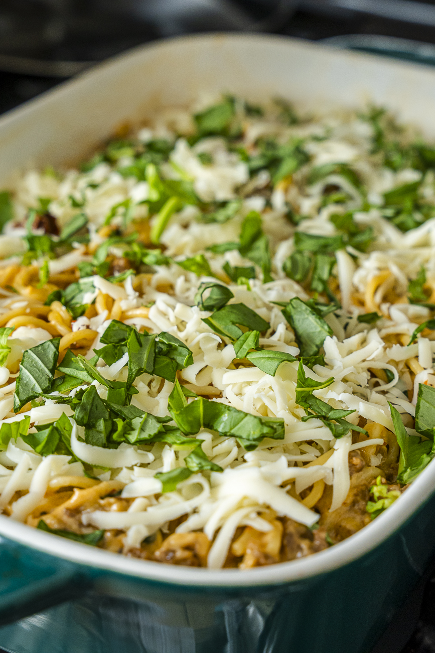 From there, stir in the spinach until it wilts, then stir in half the mozzarella and all the parmesan. Add your just-cooked spaghetti and fresh basil right into the pot, give everything a good toss, and transfer it all to your baking dish.