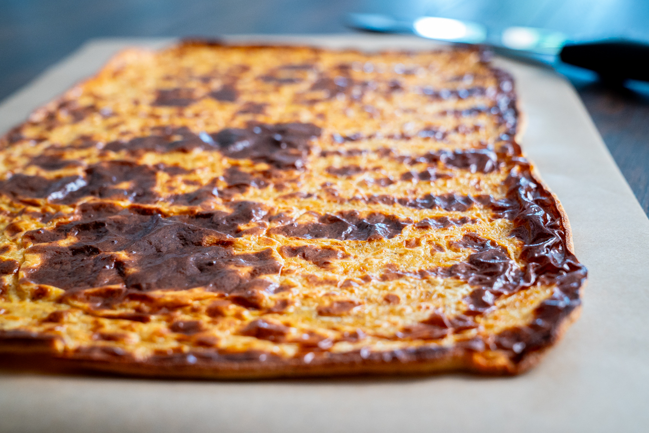 When your flatbread is baked, be sure to remove the parchment paper to a wire rack to cool it down. Your flatbread may seem too moist after the 1st bake, so let it cool, gently flip it over, and place it back onto the tray in the oven to further dry out for 4 – 6 minutes. The flatbread should feel soft and slightly crispy along the edges.
