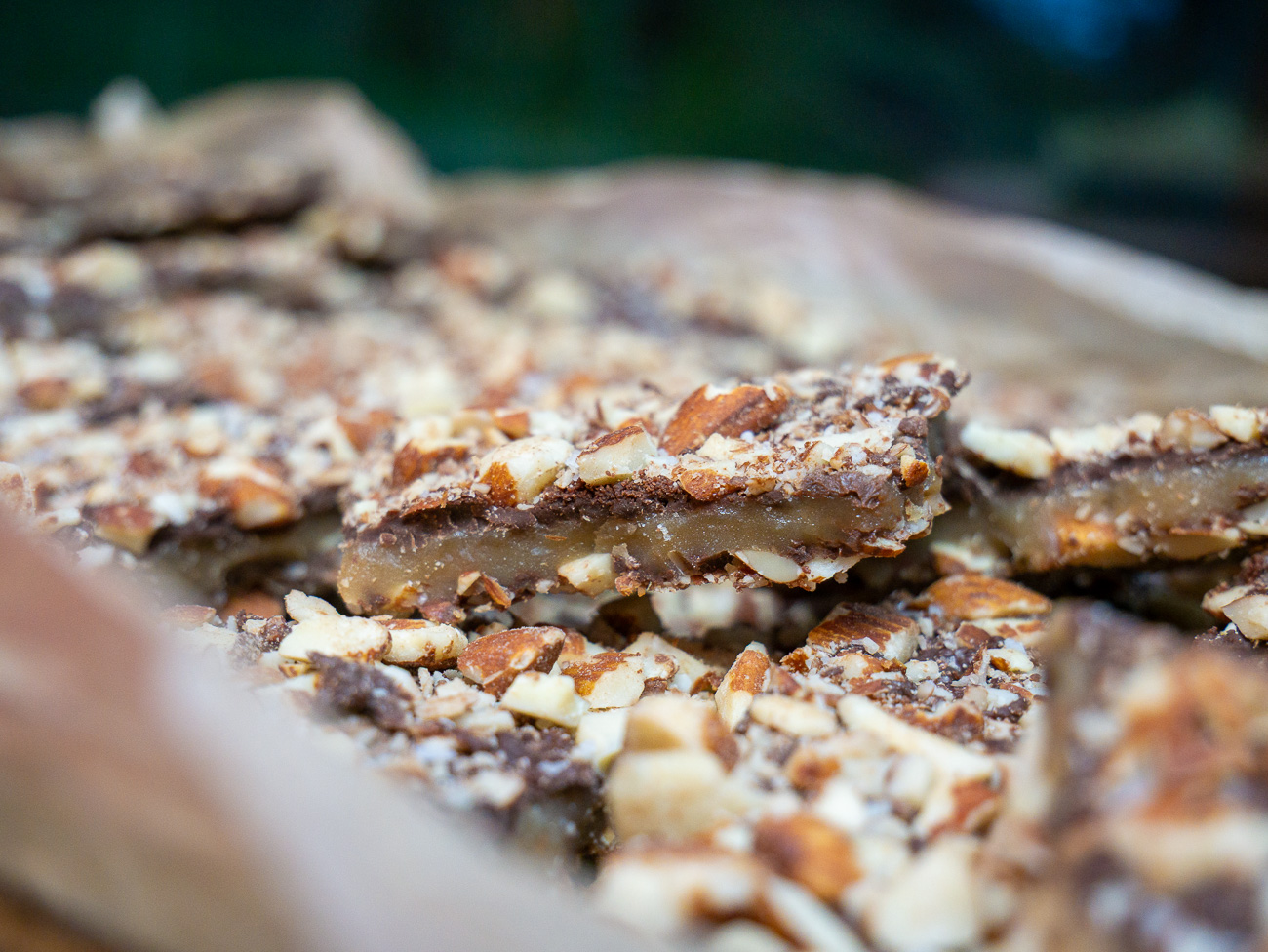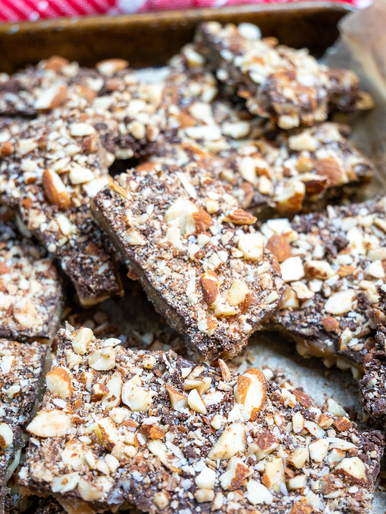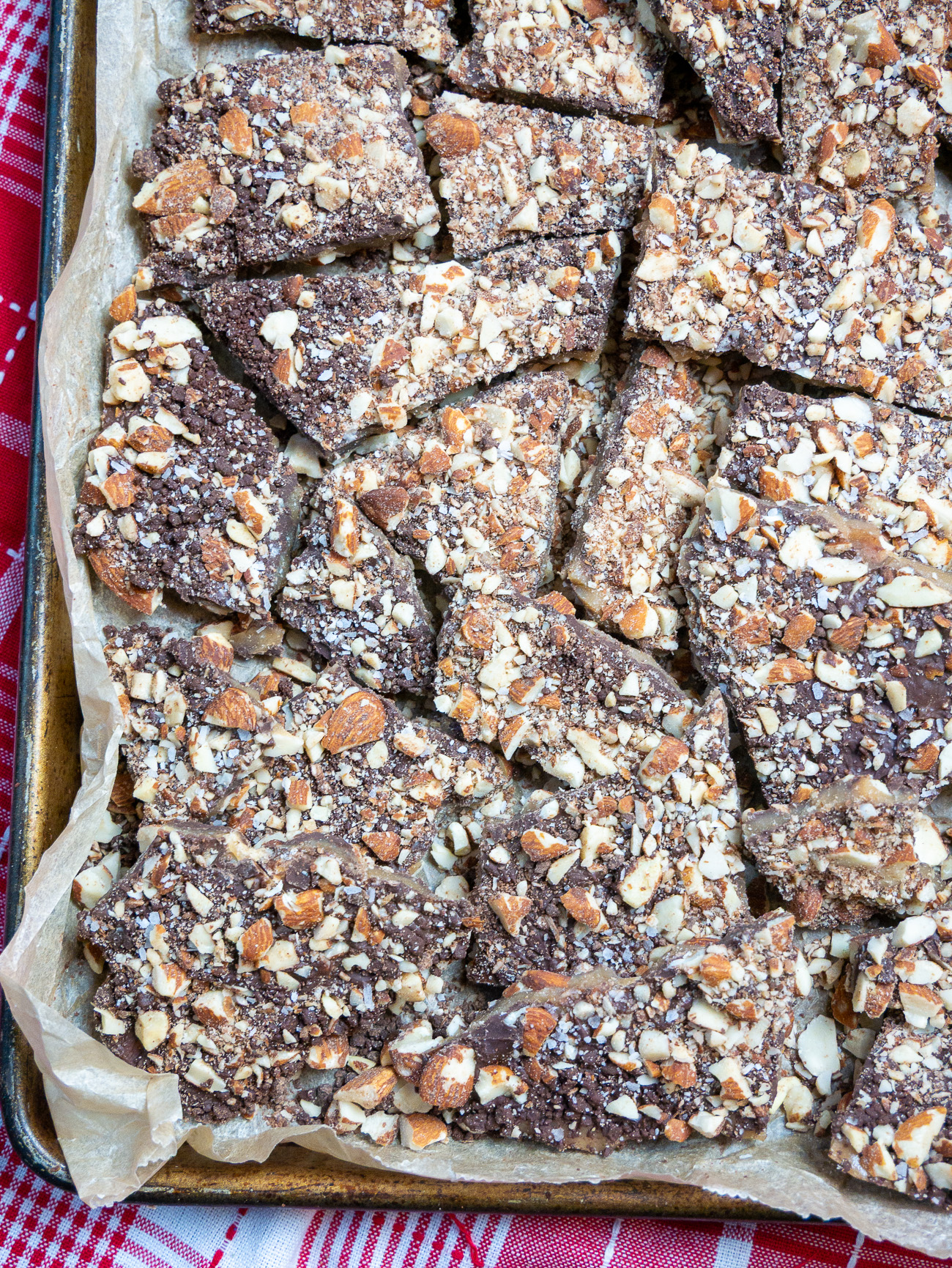 Butter Toffee is one of my favorite candies out there, especially during the holidays. I just love that hard caramel snap and the combination of sweet chocolate and almonds that coat it. But some methods can be rather daunting to make at home. Not this one! Uncle B’s Easy Butter Toffee lives up to its namesake and is truly easy, with just a few ingredients needed and no intimidating technique. (You don’t even need to melt the chocolate!)