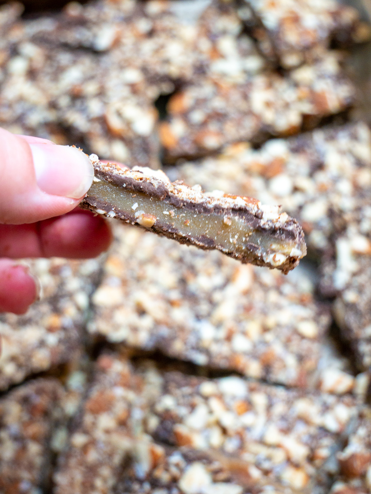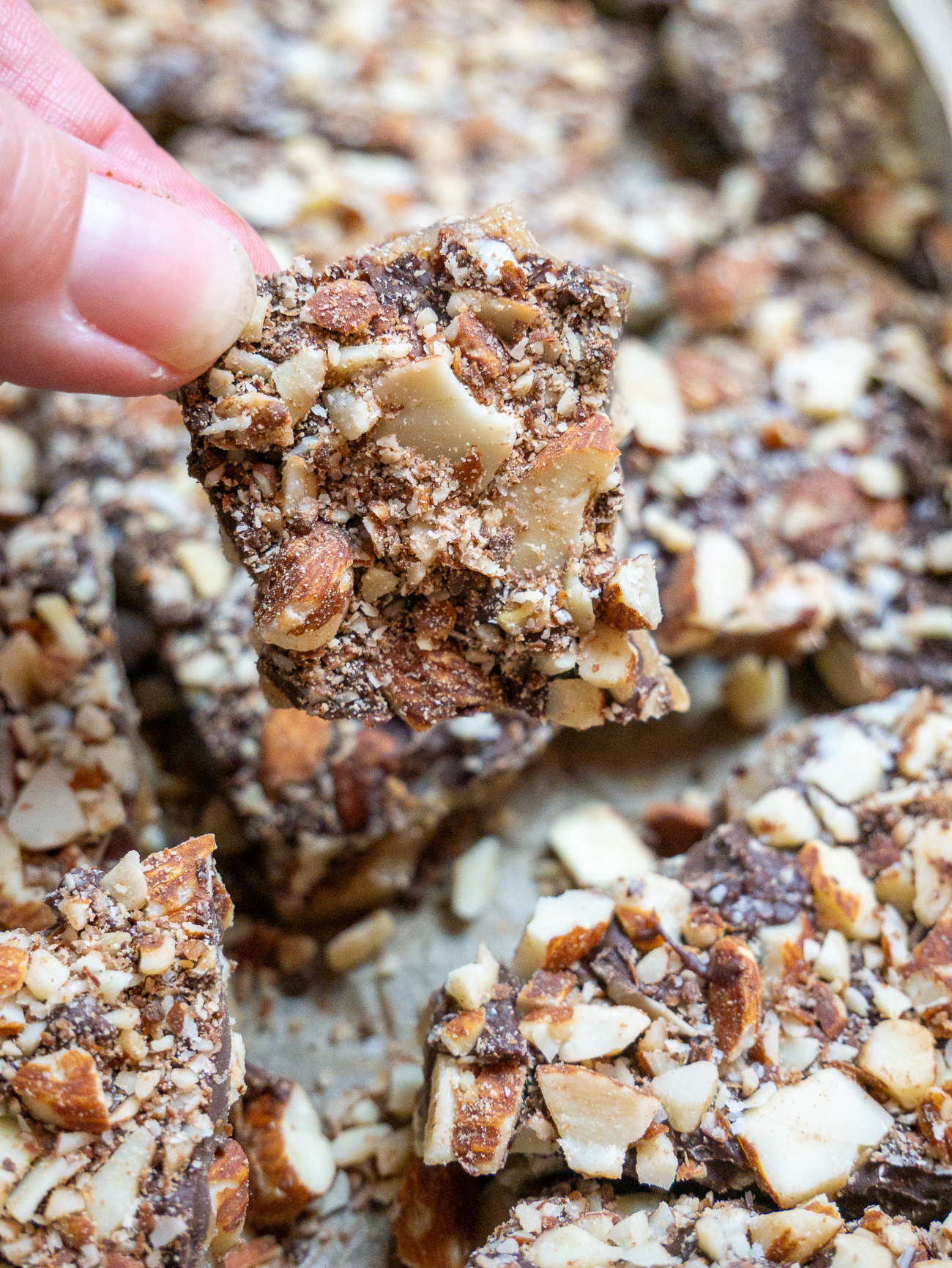 While it sits, the chocolate melts into the almonds and creates a top and bottom layer. The fridge will help that center harden and once it does, just snap it into pieces and package it up for gifting or just go ahead and get to snacking.