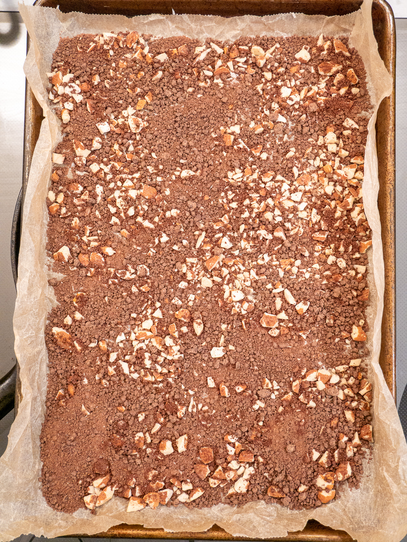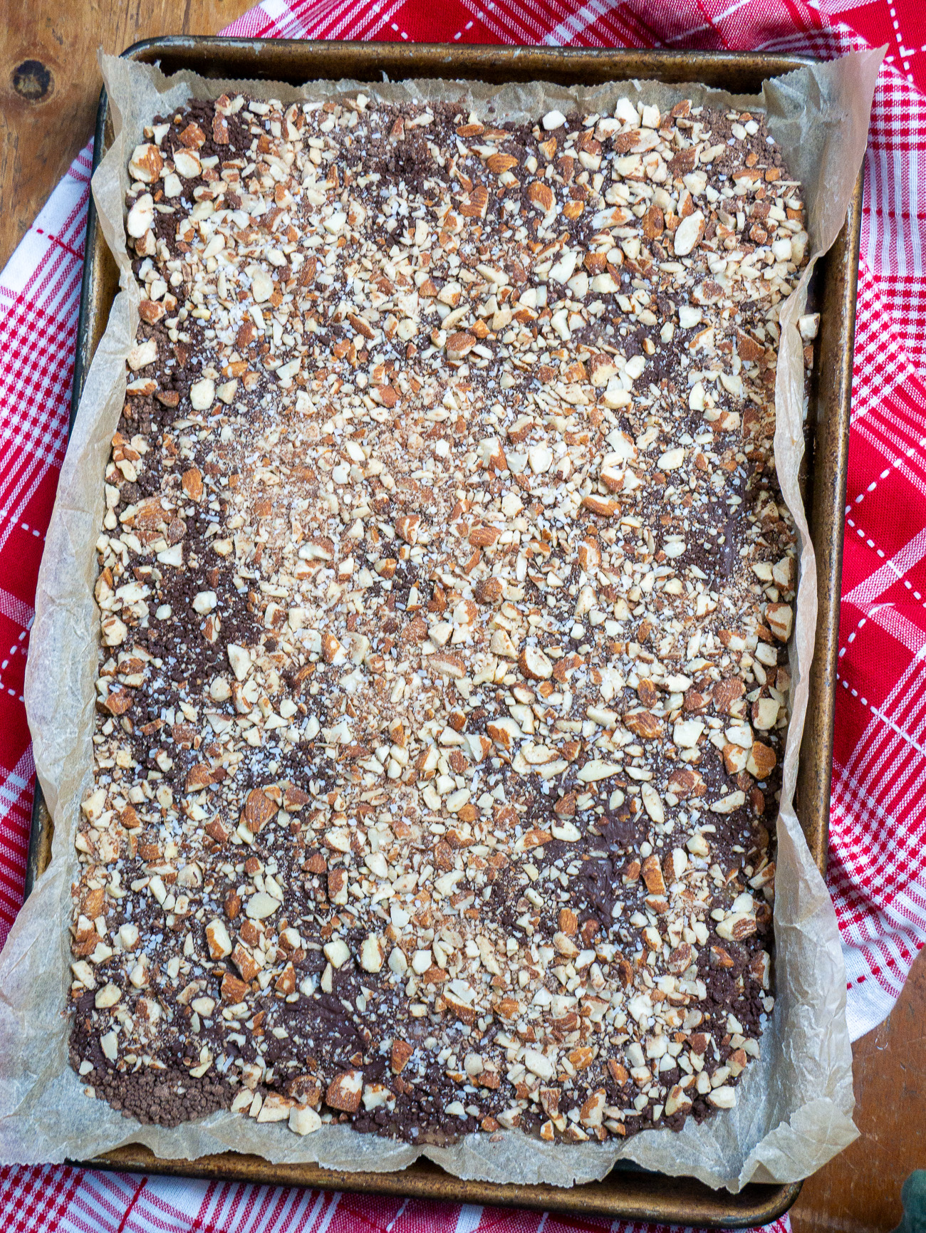 - Spread 1 cup of the almonds across the prepared jelly roll pan, then top with 1 cup of the chocolate. Set aside.