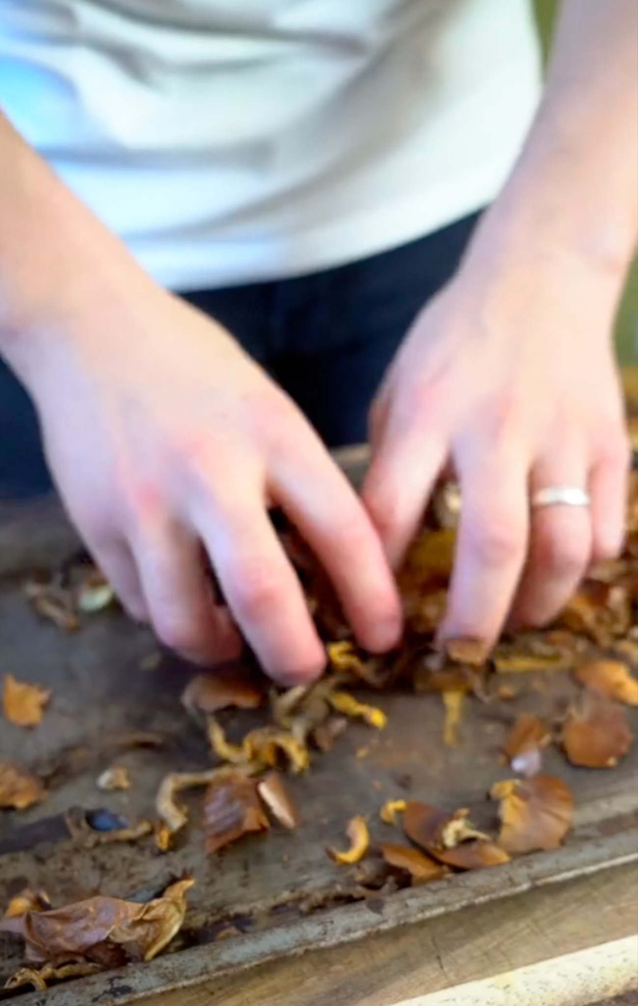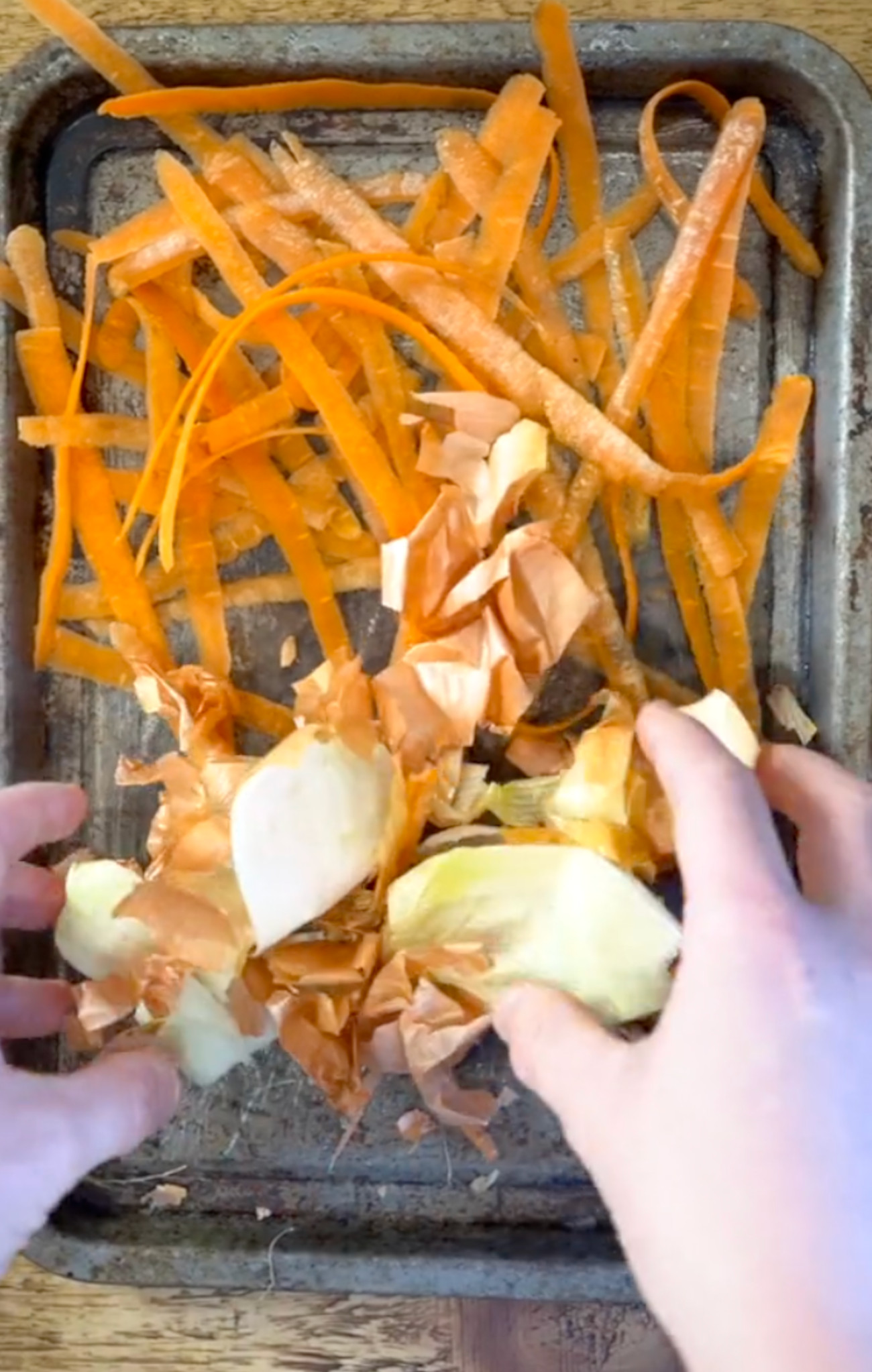 Here, TikTok user spicymoustache shows how scraps can become staples. After peeling the carrots and removing the onion skin, he sets them onto a baking tray and bakes them in the oven at 300 °F for ten to fifteen minutes.
