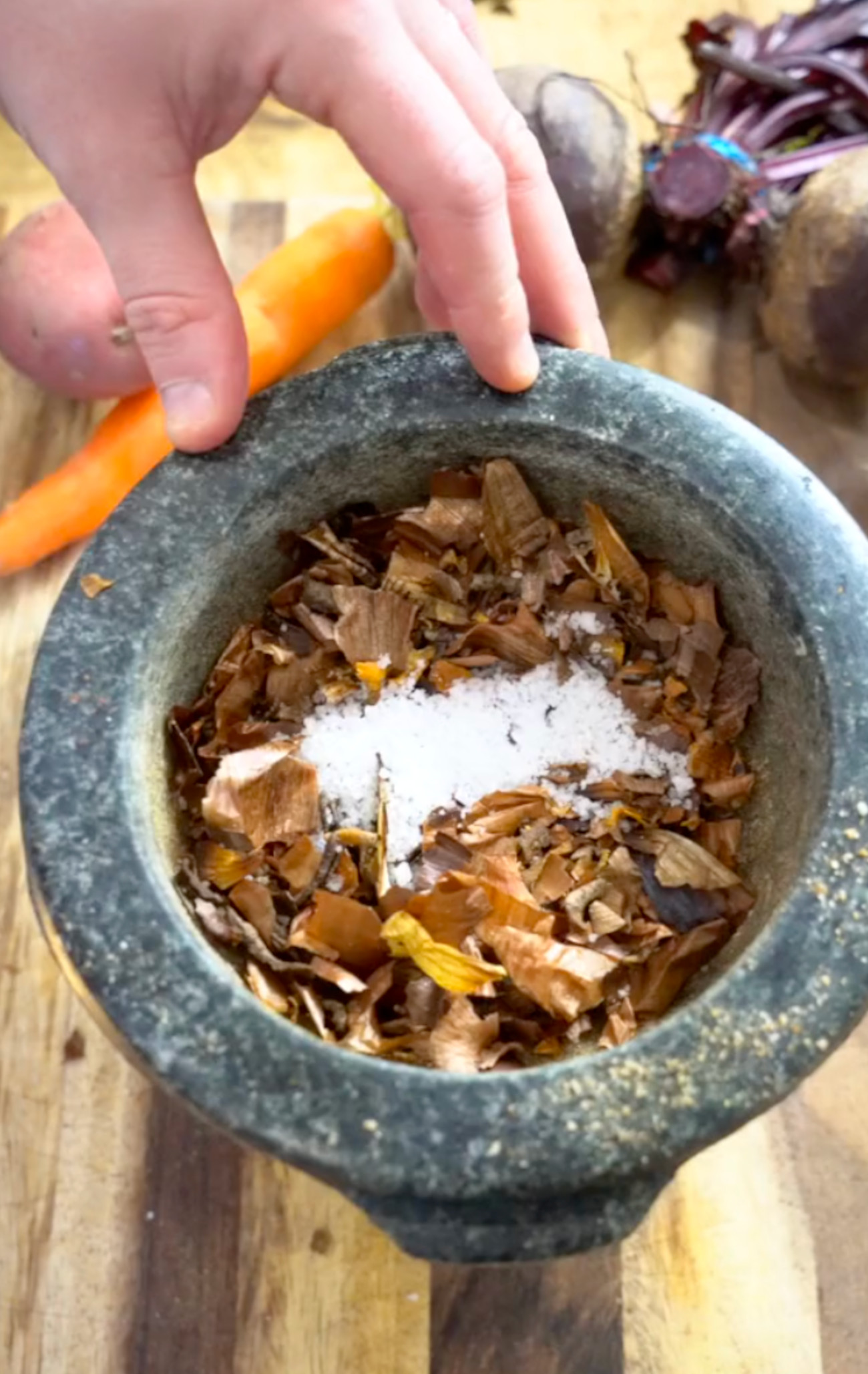 Once the vegetable scraps are golden, they are broken down in a mortar and pestle with some salt. If you don’t have a mortar and pestle, you can simply break the scraps down in a food processor.
