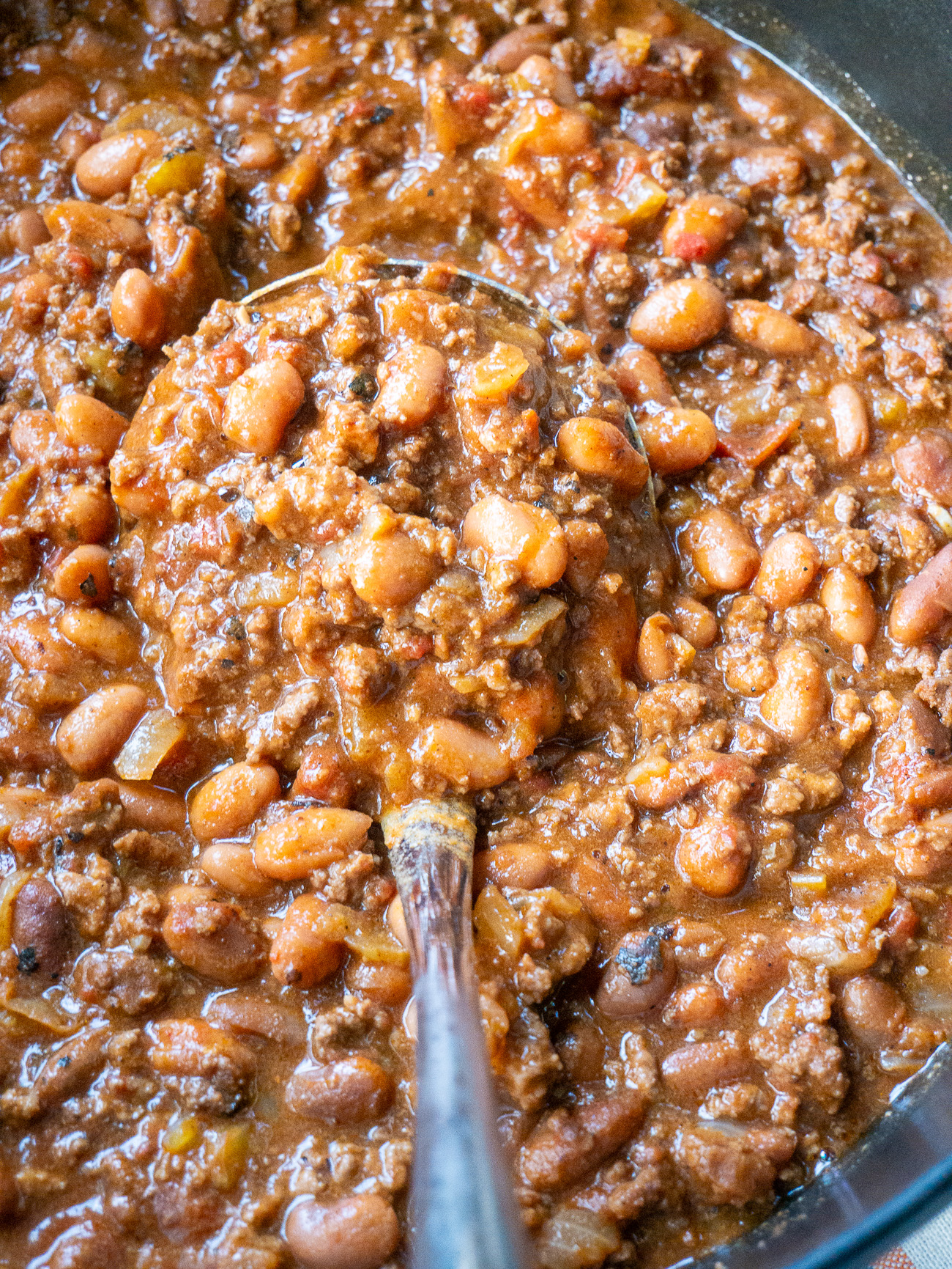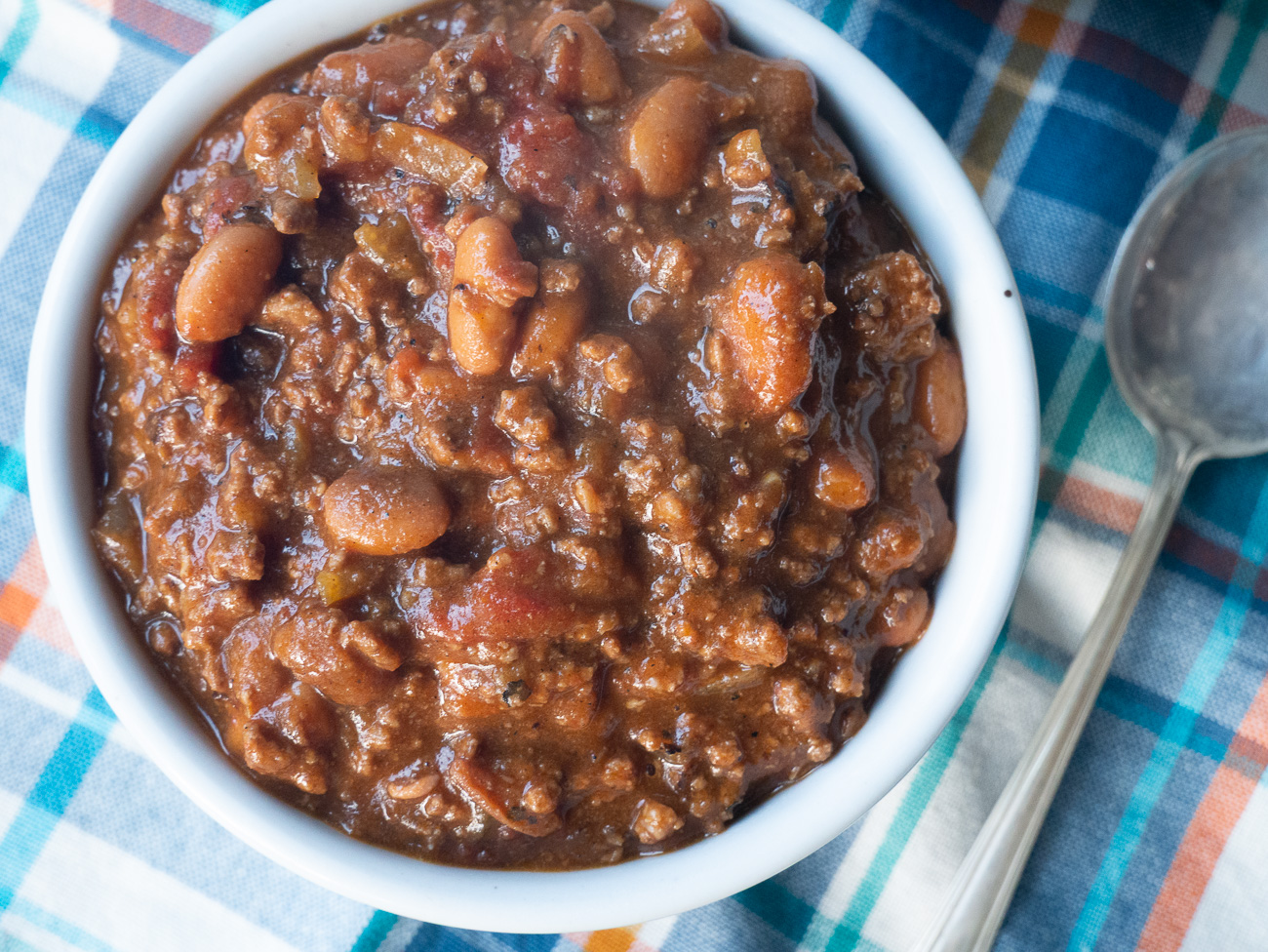 First, using canned beans. Sometimes, you just don’t think far enough ahead to do an overnight soak on beans and you want that chili now! You can easily substitute in canned beans here; you will need 3-4 cans of pinto beans. To do this, simply brown the onions with the beef and garlic in oil, and then add in the canned beans as the original recipe calls for in the last 30 minutes of simmering. It simplifies the process greatly without sacrificing flavor.
