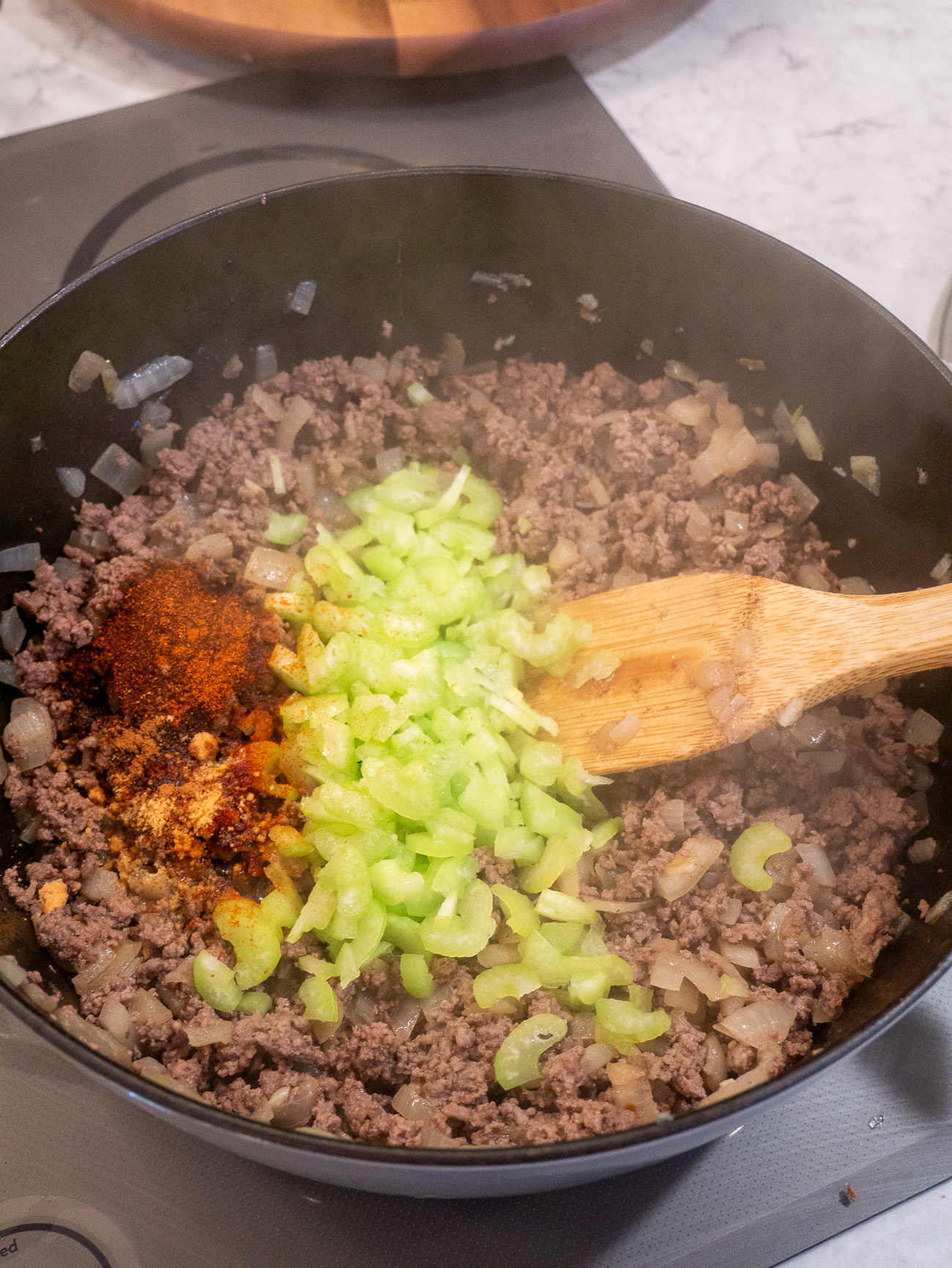 While the beans are simmering, you brown the ground beef in oil in a separate large pot and then add the celery, chili powder, paprika, mustard powder, and tomatoes and let it all simmer for an hour. At that point, you add in the (now soft) beans and let it cook about a half-hour more.