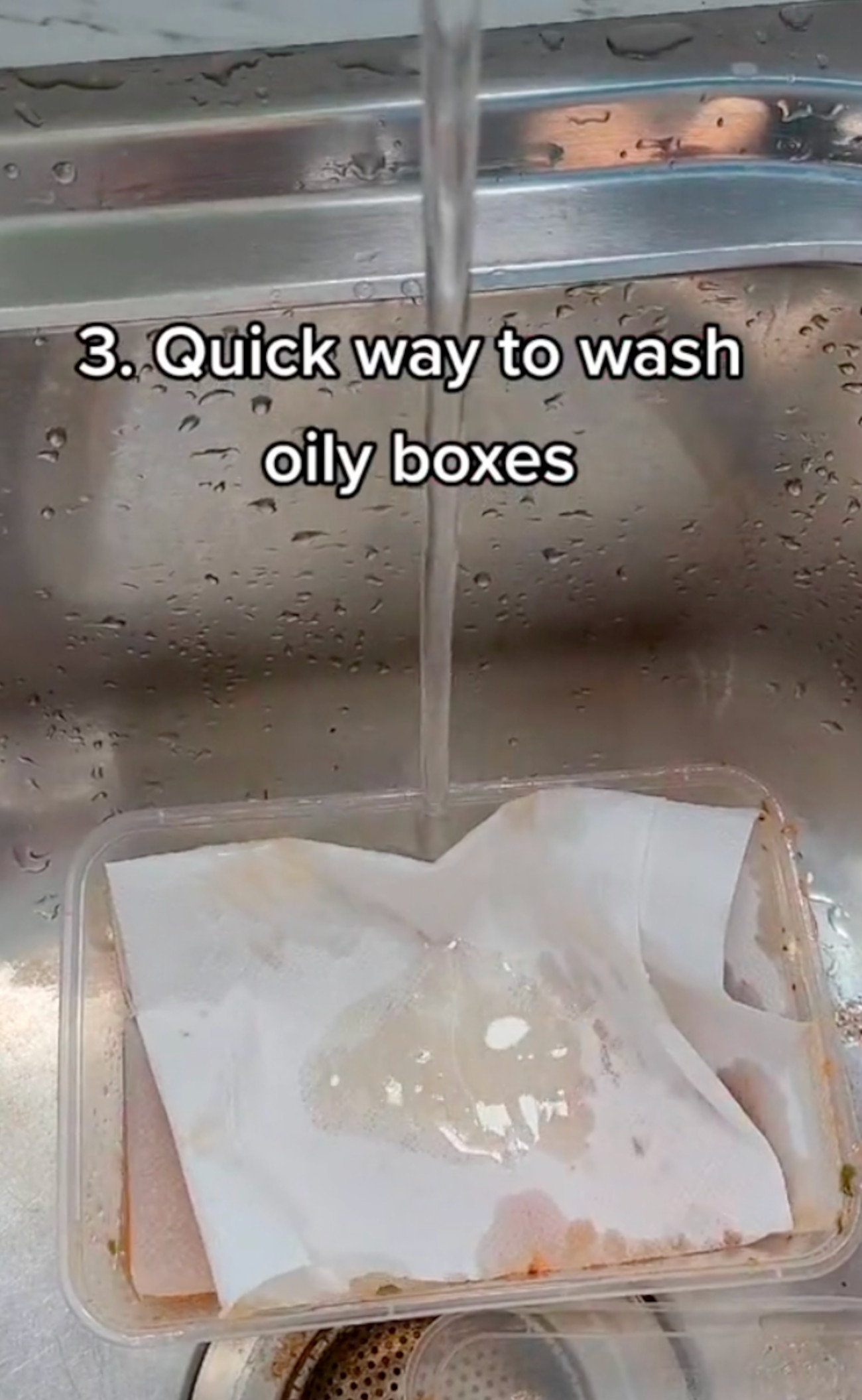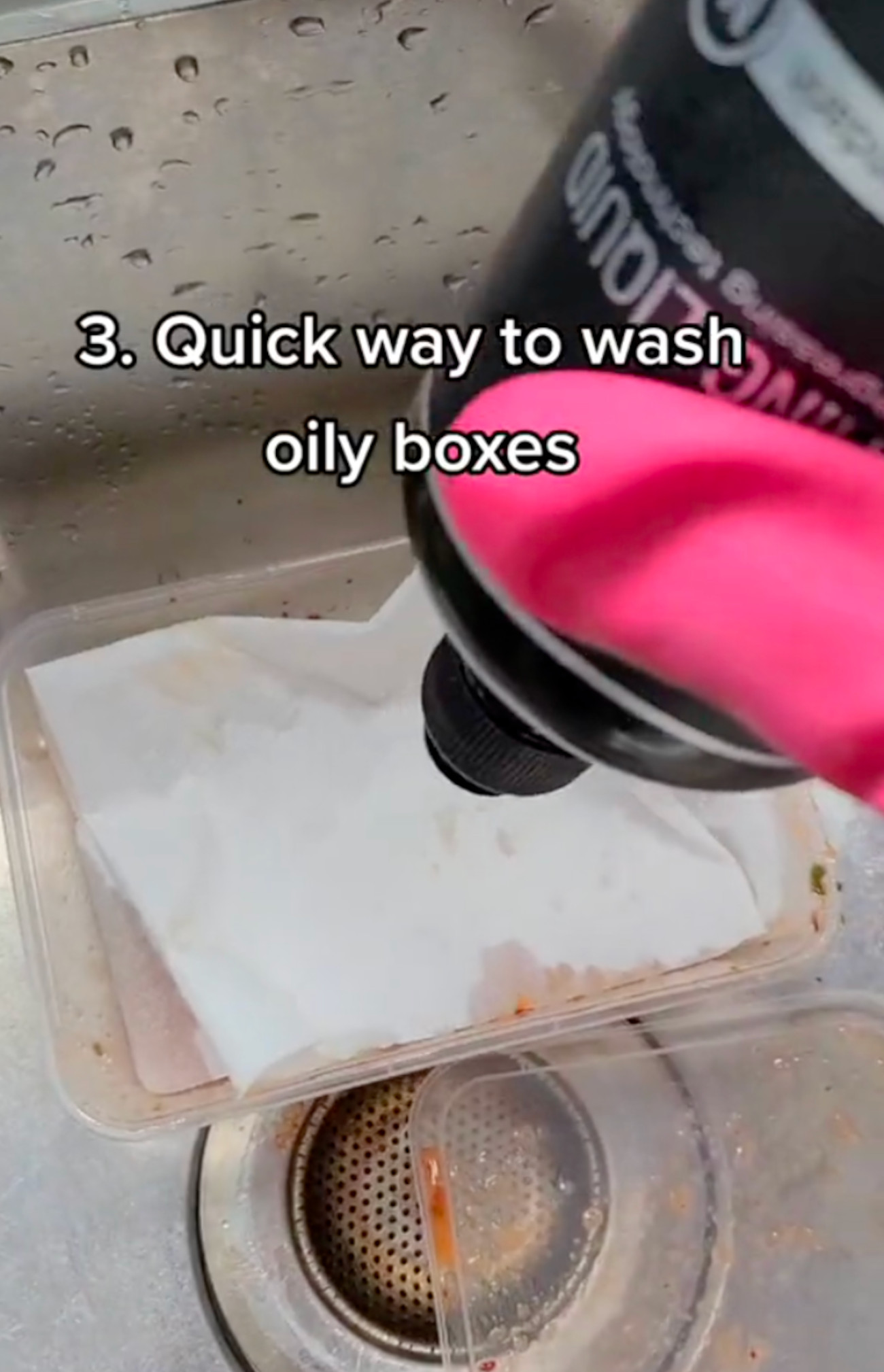 TikTok user exbrnd shows that setting and forgetting the container is part of the cleanup. After the remnants of food have been rinsed out of the container, squirt in some dish soap. Next, add a wet and folded paper towel, sudsy with dish soap, into the container as well.