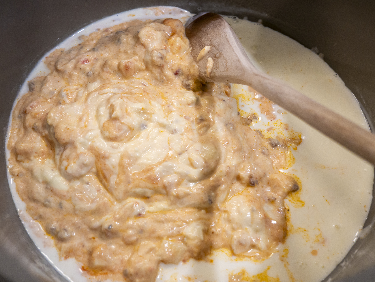 Then, you’re going to whisk some cornstarch into heavy cream and once that is thickened, stir in a bit of that marinara and the ricotta mixture. The cornstarch helps thicken the cream and gives you a sort of “faux bechamel.” It basically makes the cream more substantial so it doesn’t completely fade into the rest of the sauce.