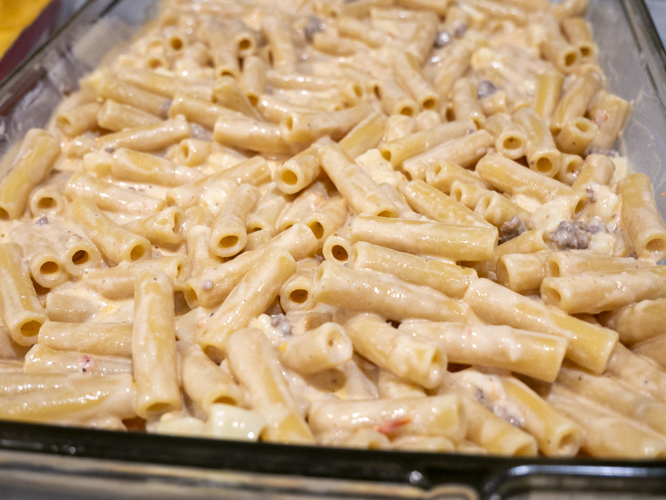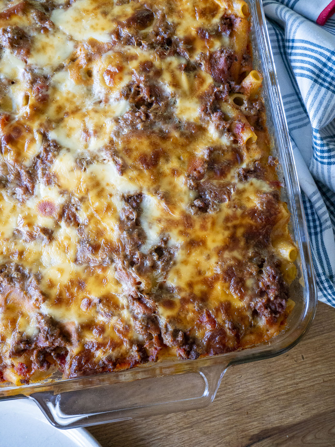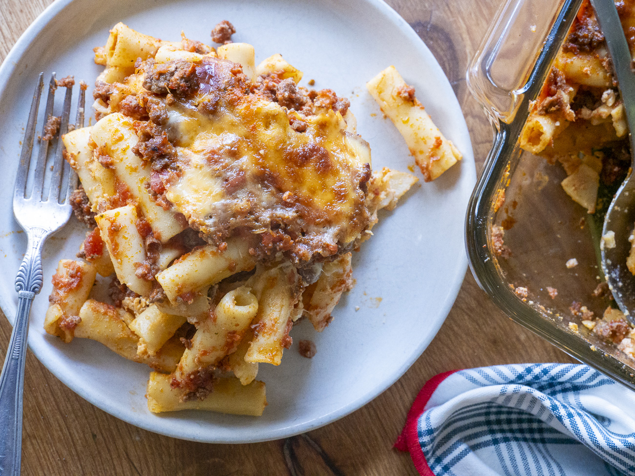 It bakes for a good long while, about an hour, but that time is totally hands off. And this isn’t just any baked ziti… this is ziti with a savory meat sauce that’s made even more comforting by some heavy cream and ricotta, and delicious pockets of ooey-gooey mozzarella running throughout.