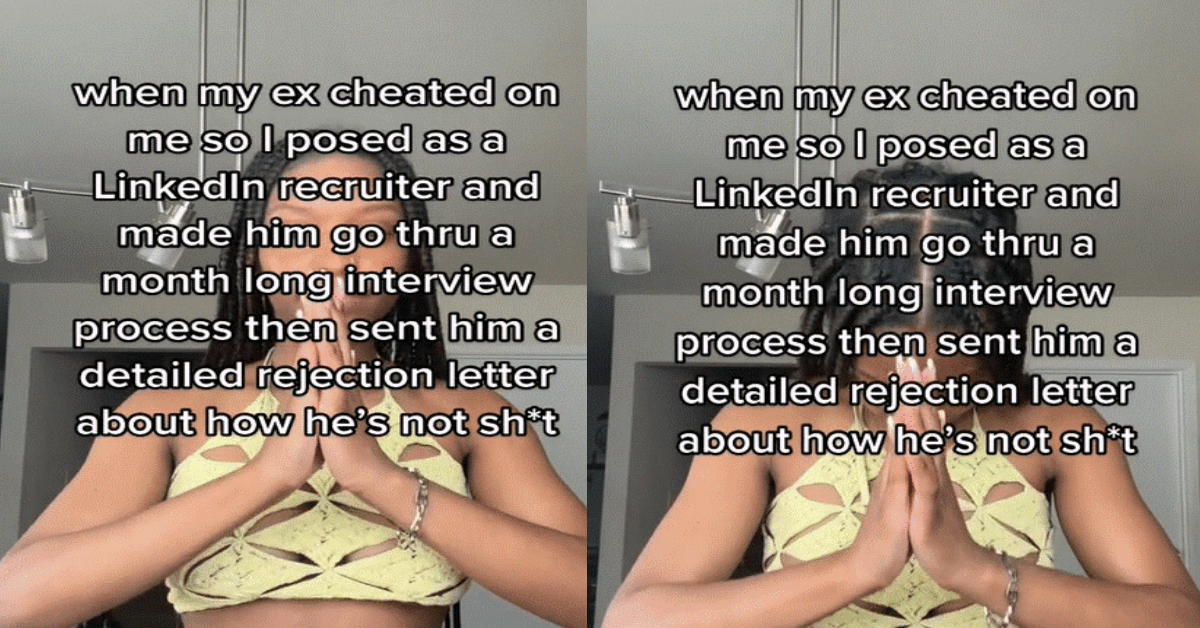 We wouldn’t be surprised to see other women following in her lead, mostly because it is too brilliant of an idea for just one person to use. Kylah explains the situation thusly: “When my ex cheated on me so I posed as a LinkedIn recruiter and made him go thru a month long interview process and then sent him a rejection letter about how he’s not s—.”