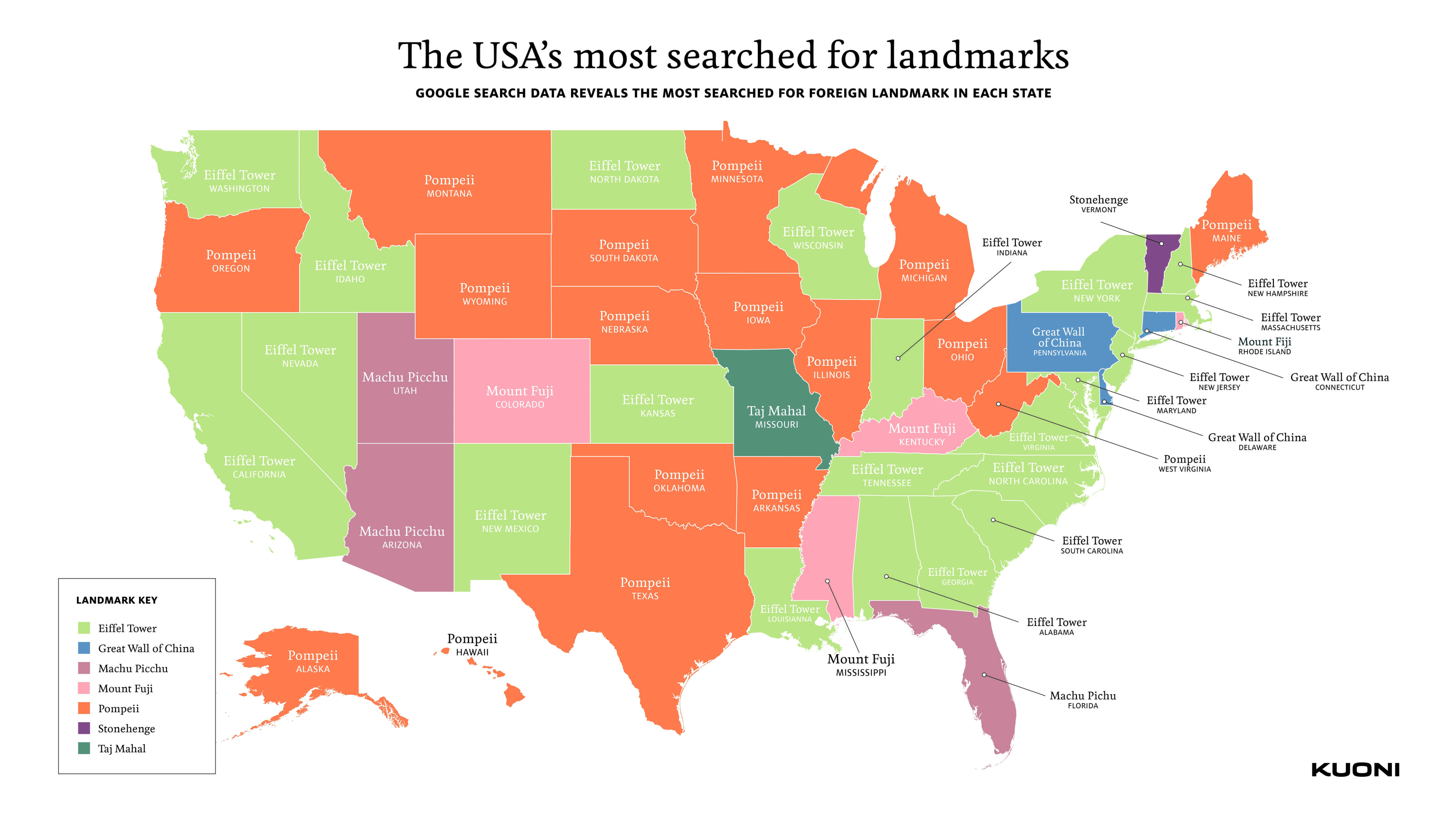 Kuoni is a luxury travel company that wants to help you know what people in your area are interested in seeing. They looked at Google analytics and trends to see what people were searching for and they came up with the most popular places on a state-by-state basis.