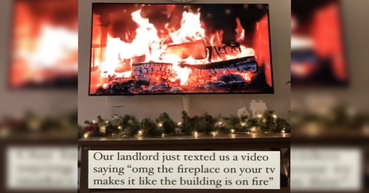 “Our landlord just texted us a video saying, ‘OMG, the fireplace on your TV makes it [look] like the building is on fire,” it says in the video.