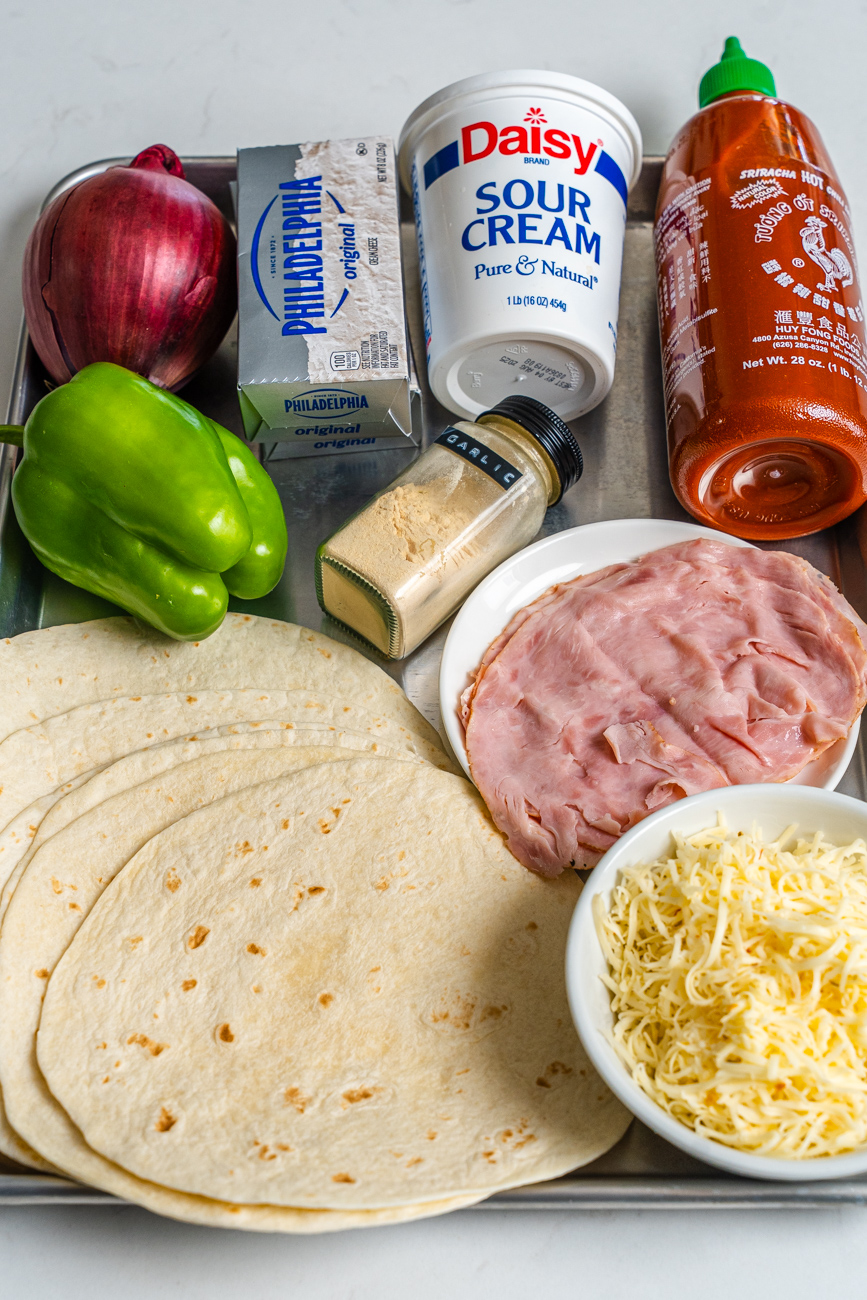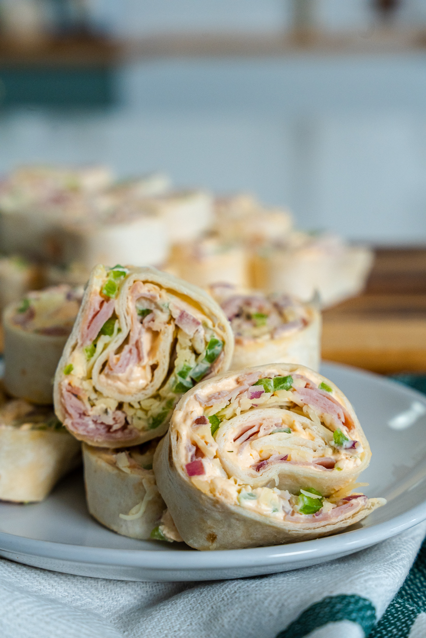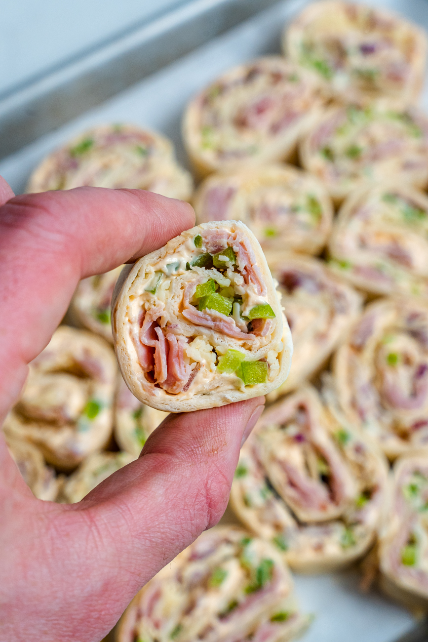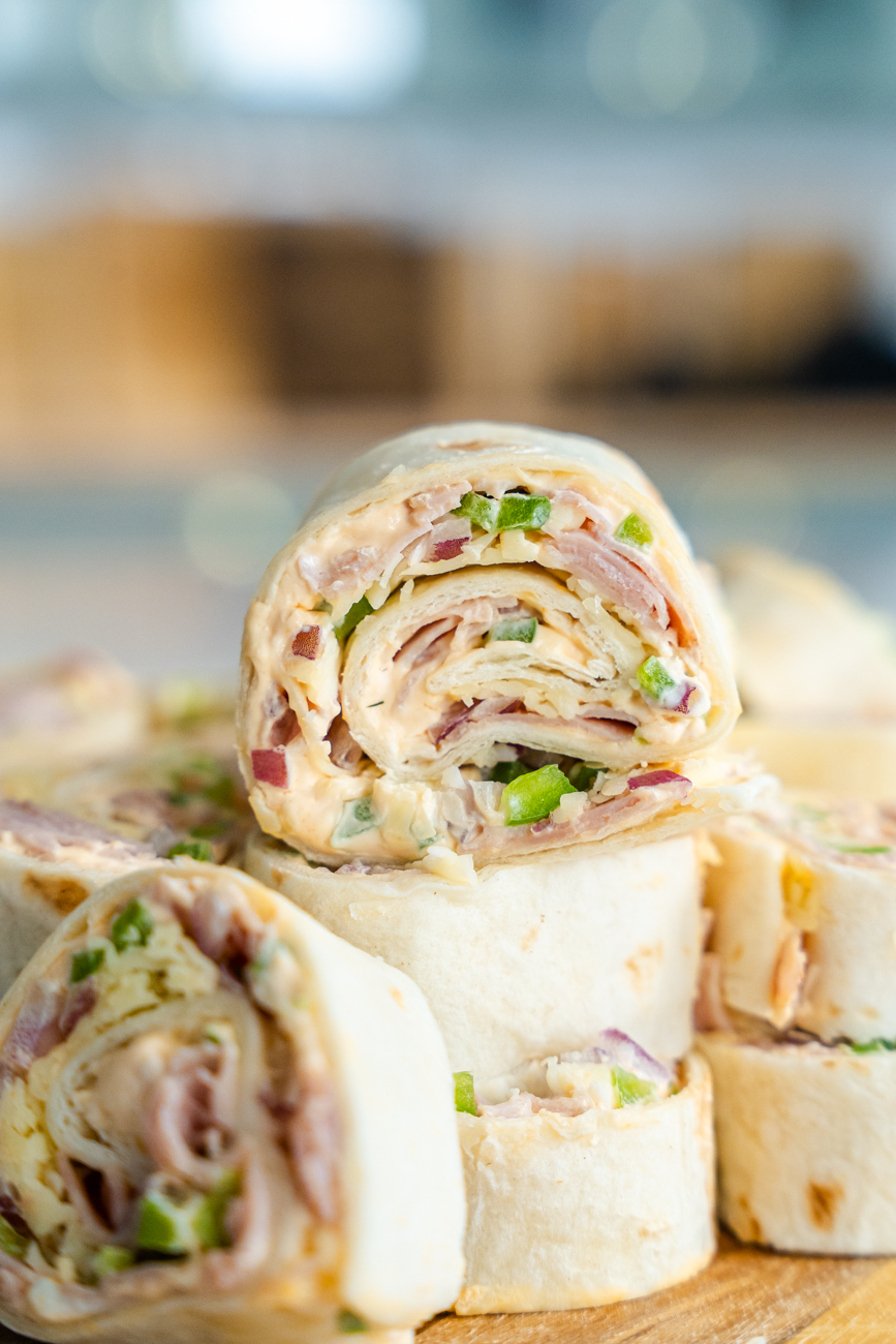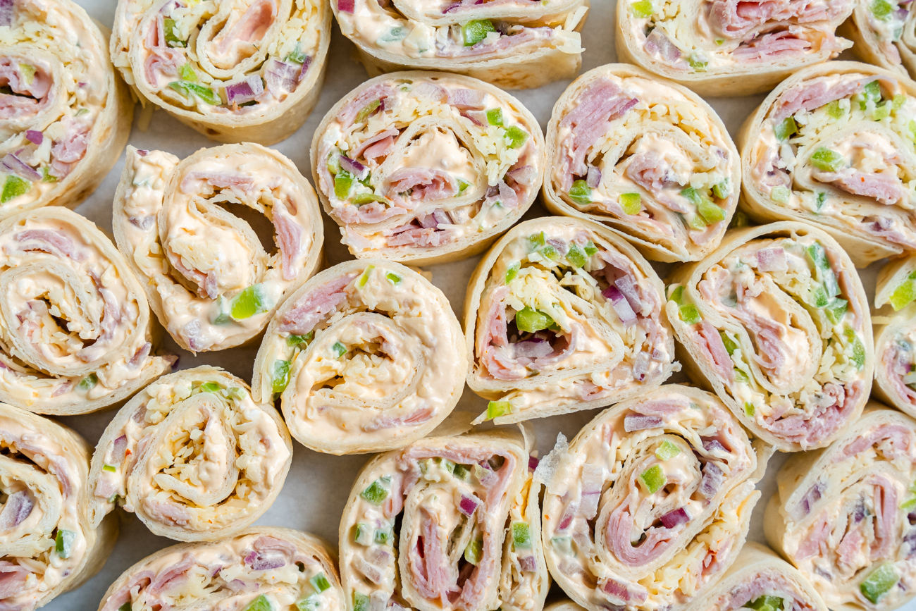 One of my go-to recipes for potlucks. Who doesn’t love a pinwheel? These pinwheels are inspired by my Uncle Rich, who helped me come up with this recipe. It’s a flour tortilla with a simple cream cheese filling mixed with garlic powder and sriracha, then topped with chopped ham, onion, and green peppers. Rolled up with Pepper Jack cheese, these pinwheels have an addictive flavor and a zesty kick. You don’t need many ingredients to make your pinwheels taste THIS good.