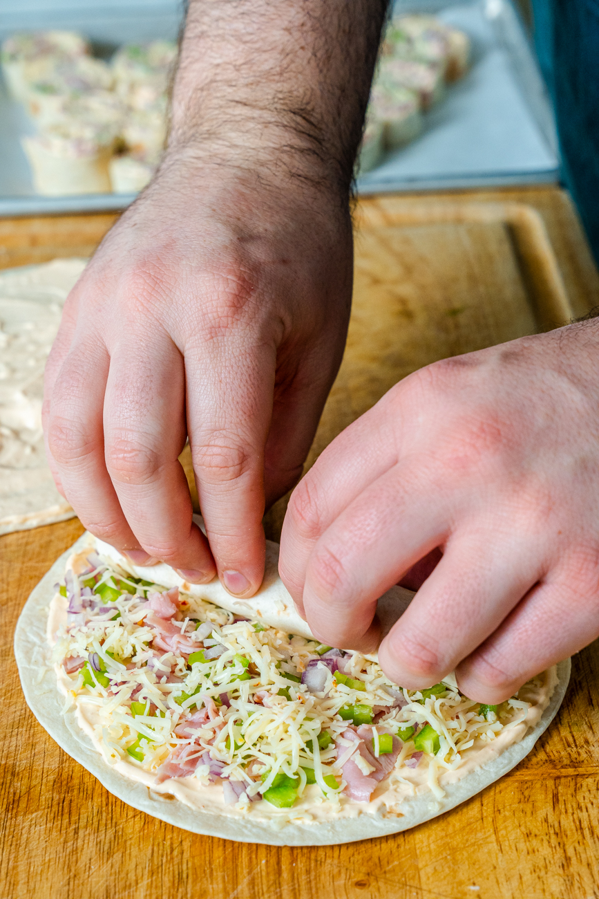 - Roll up each tortilla tightly, cut off the edges, and cut into 2“ pieces.